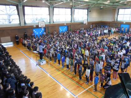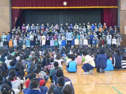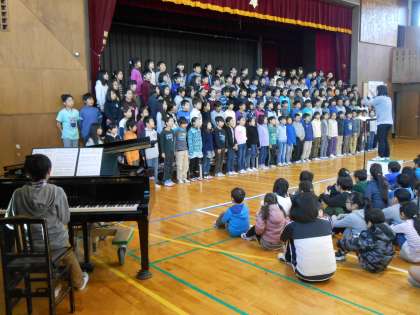 今日の音楽朝会は4年生の「出会えた君へ」の合唱でした。2部合唱のきれいな歌声を披露してくれました。そのあと、全校で歌いました。