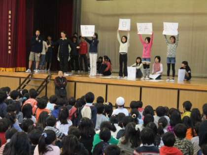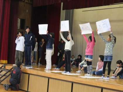 集会は、「先生紹介集会」です。先生の趣味や好きな食べ物など