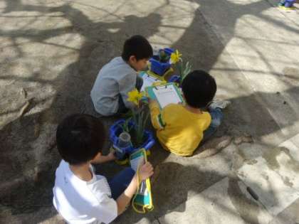 1年生が大きく咲いたスイセンのスケッチをしていました。春ですね。
