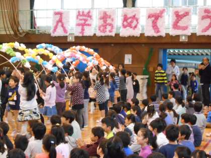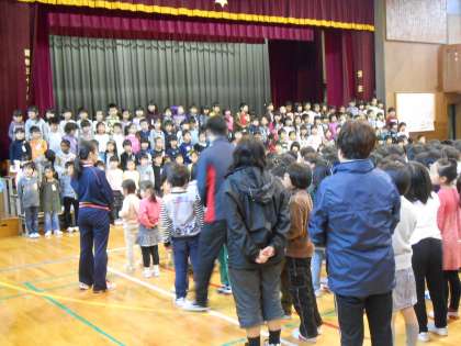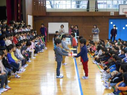6年生に手をつないでもらって1年生が入場しました。ピカピカの一年生。元気な顔が128人、体育館の舞台のひな壇に並びました。全員合唱や2年生からのプレゼント(朝顔の種)をもらいました。「ドキドキドン!1年生」を歌いました。元気な歌声でした。