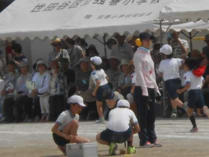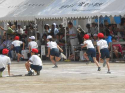 3年生の80m走です。テンポよく打たれる号砲に合わせて、全力疾走でゴール目指して走りました。