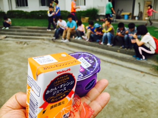 学園に戻ってきました。今日のおやつはゼリーとオレンジジュースです。疲れが吹き飛びました。