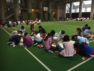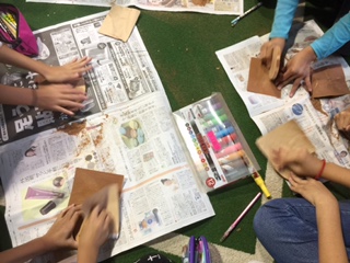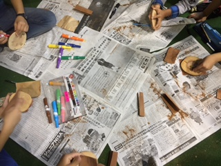川場村の間伐材を使ってコースターづくりです。ヤスリで表面を磨くと絵が描きやすくなるります。できばえは楽しみにしていて下さい。