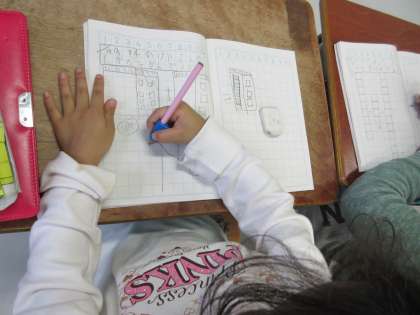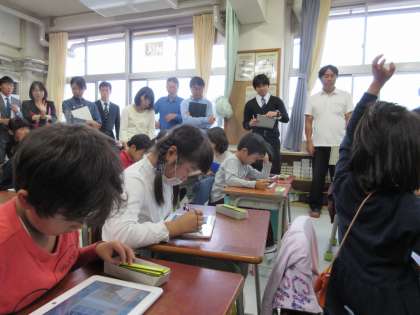 9+4=の問題を解き方を考えました。9と4の中の1を9と合わせて、10のかたまりをつくり、残った3とたして、13と答えを出す勉強をしました。子供たちは、がんばって挑戦していました。最後の練習問題は、タブレットを使って行いました。