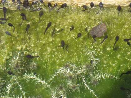 観察池にもオタマジャクシが泳ぐようになりました。花壇の