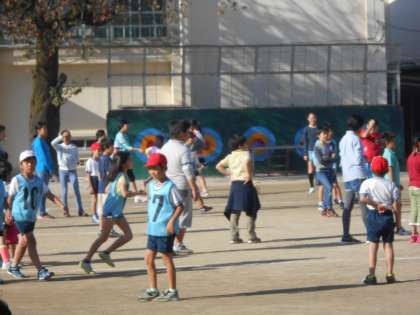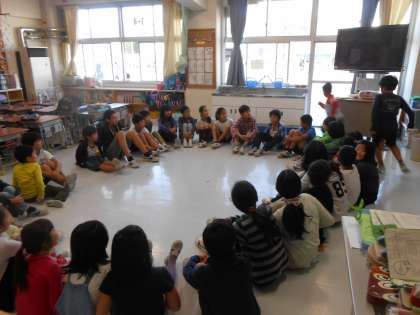 今日は集会の時間を使って、たてわり班の活動がありました。6年生が中心となってゲームや遊びを考え、一班に1年生から6年生が集まり、活動しています。