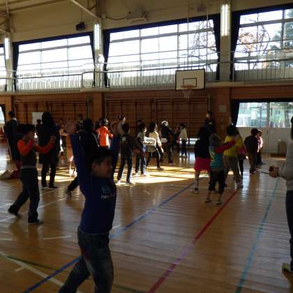 今日、旭小学校で四校交流会が行われました。集まったのは、山崎小、三宿小、旭小、鶴巻小です。弦巻小学校は、五反田行のバスで行きました。妖怪ウォッチ体操やゲーム、借り物競争などをして、交流を深めました。そのあと、お弁当を食べました。