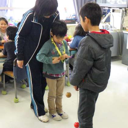 1年生と2年生が交流をしました。昔遊びを2年生に教えてもらいました。こま回しやあやとりなどを丁寧に、優しく1年生に2年生が教えてくれました。