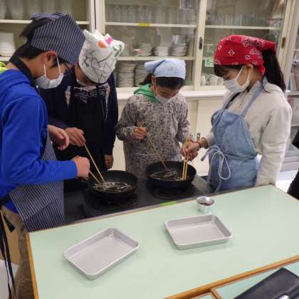 6年生が、家庭科調理実習で伝統的な料理に挑戦しました。その料理は、おせち料理として作られる「田づくり」です。また現代的にアレンジしたナッツを使ったものにも挑戦しました。とてもおいしくできました。