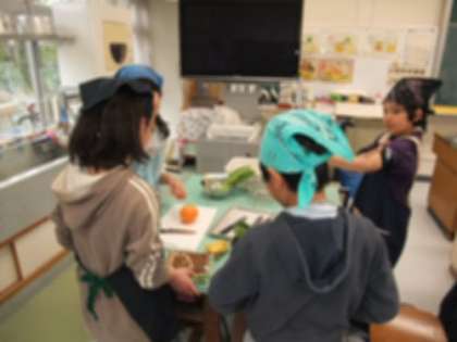 調理実習です。危なげな手つきで包丁を握っていました。