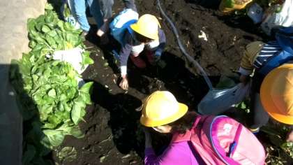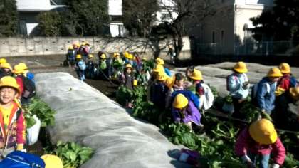 今日、小松菜採りに桜新町にある秋山農園に1年生が行きました。リュックをしょっていざ出発です。今年は豊作で、葉っぱも大きく、三袋もとって帰ってきた子供もいました。お家でどんな料理になるのかな?