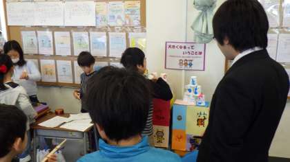 今日、1・2時間目を使って、2年生が考えた遊びを1年生が、体験させてもらいました。ボーリング、もぐらたたき、的当てなど2年生が考え、手作りの遊びが各教室に展開されました。1年生にやり方をやさしく説明する2年生の姿が見られました。
