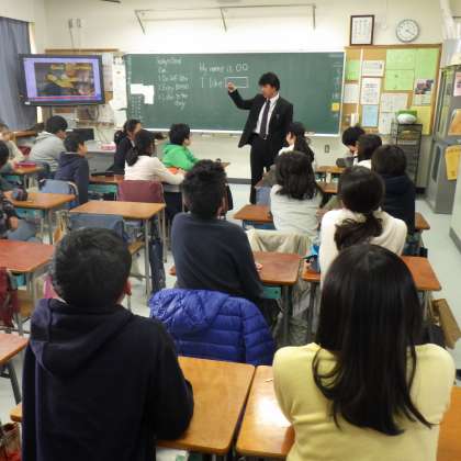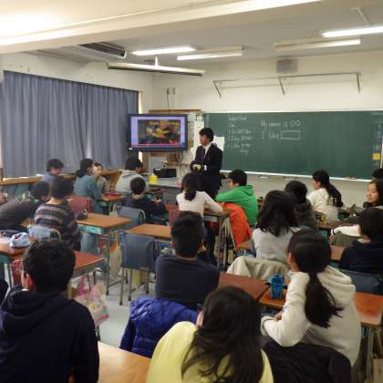 駒沢中学校の英語の先生が、出前授業で6年生に英語を教えてくれました。英語のみの授業ということでしたが、みんな、自分の名前や好きなことを話すことができました。