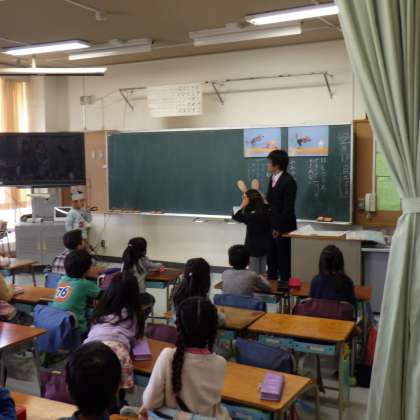 1年生は「はしのうえのおおかみ」というお話を題材に「親切」をテーマに授業が進みました。おおかみとうさぎのお面をかぶり、ロールプレーをして、おおかみの気持ちを考えました。