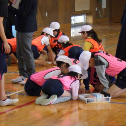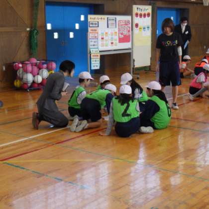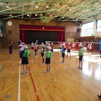 今日は、体育館で5時間目4年生の体育の研究授業がありました。バトミントンのネットを使った、ネット型キャッチバレーをしました。子どもたちは、楽しんで取り組んでいました。