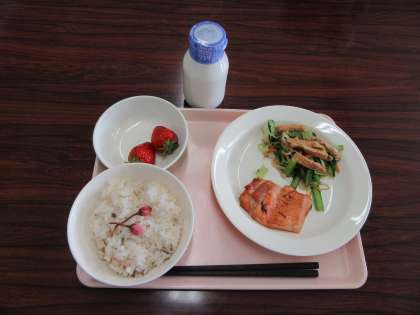 桜の花のごはん 牛乳 鶏肉の照り焼き おひたし くだもの