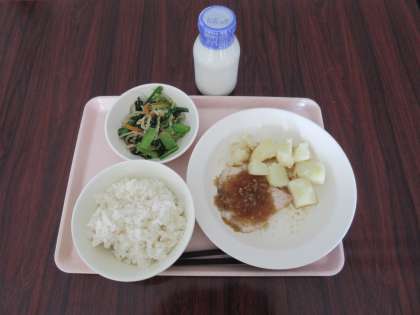 ごはん 牛乳 粉ふきいも 魚のバーベキューソースかけ 野菜のごま和え