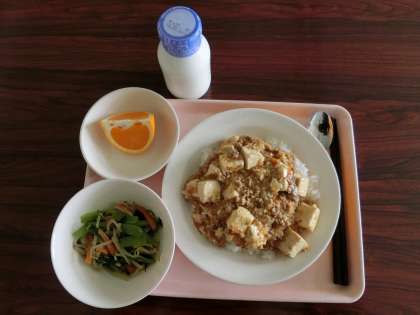 麻婆豆腐どんぶり 牛乳 ナムル くだもの(清見オレンジ)