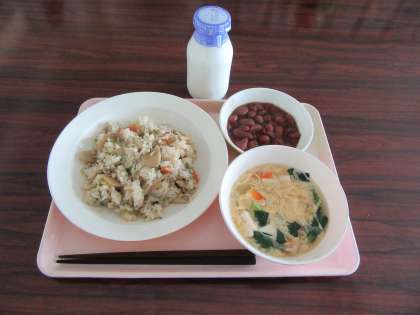 たけのこごはん 牛乳 かきたま汁 煮豆(うずら豆)
