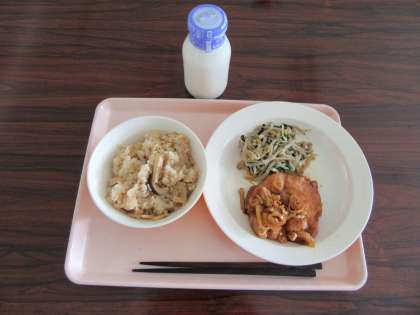 五目おこわ 牛乳 鶏肉の唐揚げ中華風 もやしの中華ごま味