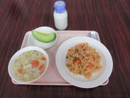 チキンライス 牛乳 たまごスープ くだもの(メロン)
