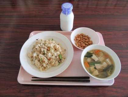 鶏そぼろごはん 牛乳 山菜みそ汁 ぶどう豆(だいず)