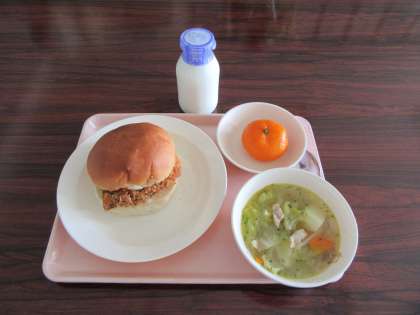 フィッシュサンド 牛乳 ベーコンと野菜のスープ 冷凍みかん