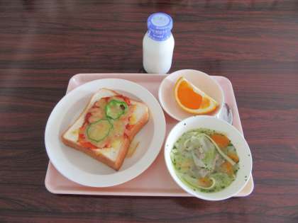 ピザトースト 牛乳 ヌードルスープ 清見オレンジ