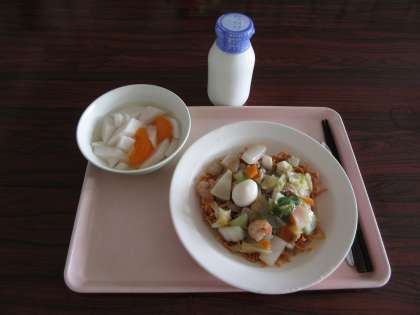 揚げそば五目野菜あんかけ 牛乳 杏仁豆腐(フルーツ入り)