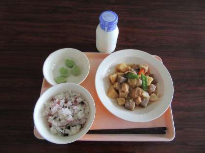 梅わかごはん 牛乳 肉じゃがのうま煮 そらまめ
