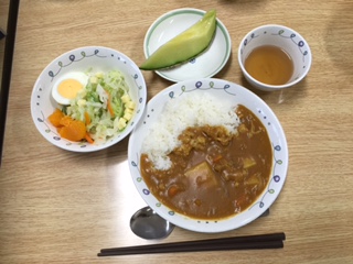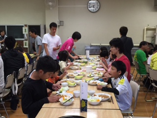 移動教室といえばカレーライスです。今晩のイベントはキャンプファイヤです。残さずしっかり食べましょう。