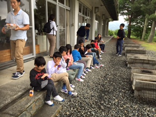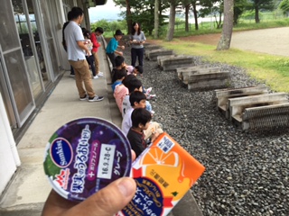 学園に帰ってきました。今日のおやつはゼリーとオレンジジュースです。おやつのあとは入浴の時間です。