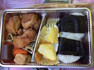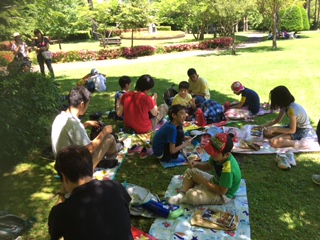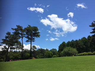庭園にある広い芝生で昼食を食べました。青い空に白い雲が浮かんでいました。