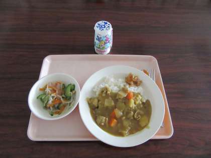 チキンカレーライス ふじんづけ 乳酸飲料(ジョア)こんにゃくサラダ