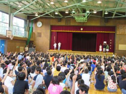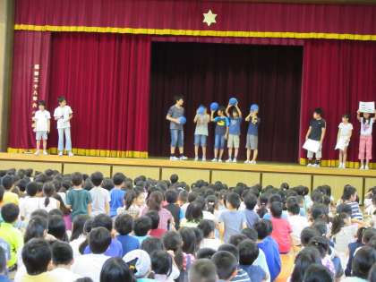 7月6日(水)児童集会がありました。体育館の舞台を使って楽しいクイズを行い、集会委員会の演出に子どもたちは楽しんで参加していました。