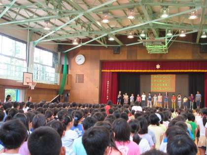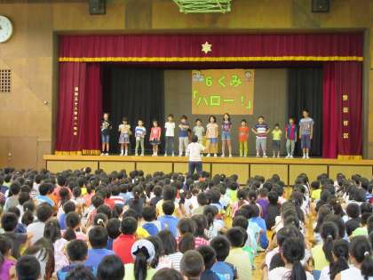 本日は体育館で音楽朝会を行いました。6組さんのハローの歌の見本をもとに、全校児童のやさしい歌声が響いた和やかな集会でした。