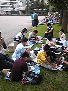 宿舎に着きました。部屋での荷物の片付けも終わり、河口湖の湖畔でお弁当です。