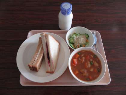 二色サンド 牛乳 ビーンズシチュー フレンチサラダ