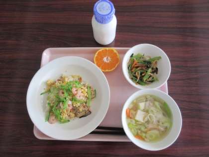 ちらし寿司 牛乳 くだもの(菊花みかん) すまし汁 野菜の辛子しょうゆかけ
