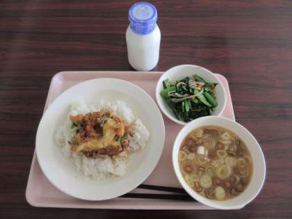 かぎ揚げどんぶり 牛乳 なめこ汁 おひたし