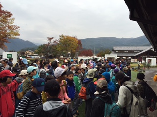 雨が降ってきたので、急いでご飯を食べてお土産を買いました。これからバスに乗って学校へ戻ります。
