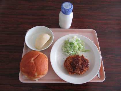 パインパン 牛乳 くだもの(りんご)かぼちゃコロッケ ゆでキャベツ