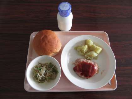 丸パン 牛乳 野菜ソテー アップルチーズハンバーグ カレーポテト