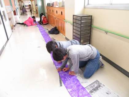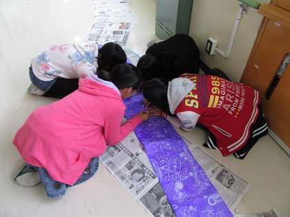 本日、明日からの展覧会の準備のために6年生が、長い染めた和紙に思い思いの好きなものや大切なものを描きました。明日の展覧会楽しみにしていてくださいね。