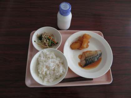 ごはん 牛乳 サバの味噌煮 じゃがいもの甘辛煮 野菜のからし醤油かけ