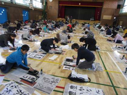 本日は、体育館で静謐の中、集中して書初めを行いました。それぞれがお手本を見ながらも心を込めて自分なりの筆使いをしていました。