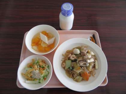 五目野菜あんかけそば 牛乳 パリパリサラダ 杏仁豆腐(フルーツ入り)