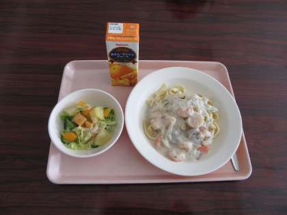 生パスタのホワイトソースかけ オレンジジュース フルーツサラダ