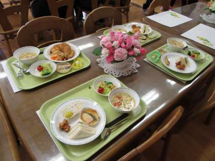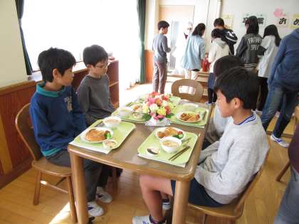 本日は、6年生が卒業を祝うためのバイキング給食をしました。クロワッサンにチキンライス・サンドイッチに加えて、チキンやサーモンなど自分の好きなものを食べれる量を取っています。いつもよりも少しおすましした6年生です。楽しそうですね。