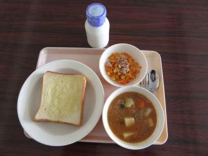 ハニートースト 牛乳 ハンガリーアンシチュー にんじんサラダ